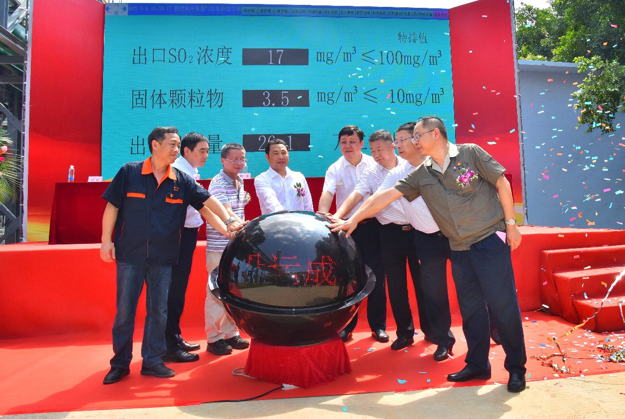 在项目投运仪式现场,随着启动球的开启,明亮的LED屏实时显示出来的“出口SO2浓度、固体颗粒物、出口风量”三个在线监测数据全部达到国家及省、市环保部门要求的“特别排放限值”水平。这标志着韶关冶炼厂“烧结机环集烟气超低排放技改项目”取得了圆满成功,环保水平又登上了一个新的台阶,为韶关坚持生态优先、绿色发展再添新枝。
